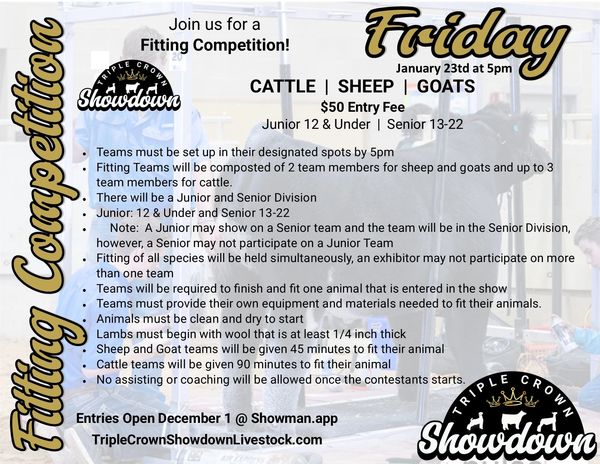 Payout premiums will be mailed to winners within 14 days of event. Several days after the event we will post a listing of all premiums won by exhibitor to our website, https://triplecrownshowdownlivestock.com/, these will be available for audit for 7 days prior to payments being issued, it is the responsibility of every exhibitor/parent to review for accuracy, once the audit period closes there will be no changes/edits to premium payouts.